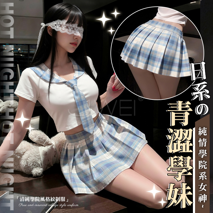 甜心刑警.胸前交叉繫帶清純百褶透視白紗COS制服套裝【上衣+短裙-藍+白】