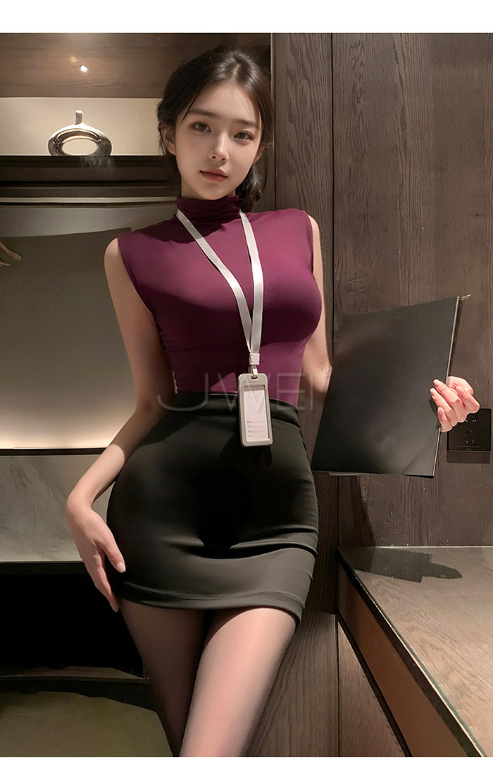 情秘演繹.胸部可剪緊身包臀禁慾系OL秘書套裝-紫+黑【上衣+工牌+包臀裙+內褲】