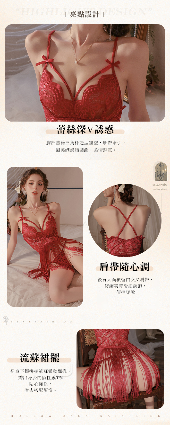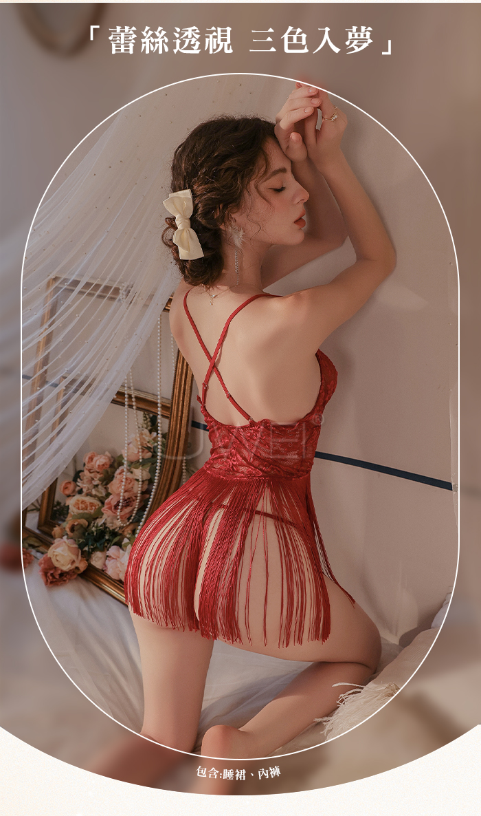►您現在的位置:首頁>輕舞搖曳.網眼蕾絲深V誘惑流蘇裙襬露臀睡裙【睡裙+T褲】酒紅