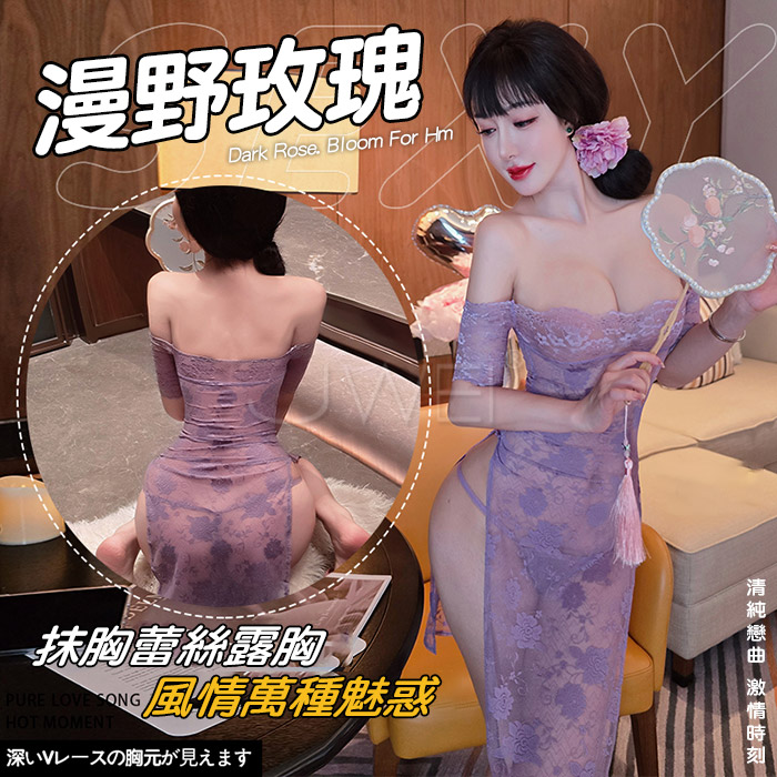 漫野玫瑰.純欲一字肩蕾絲柔美鏤空開衩連身睡衣 【連衣裙+T褲】