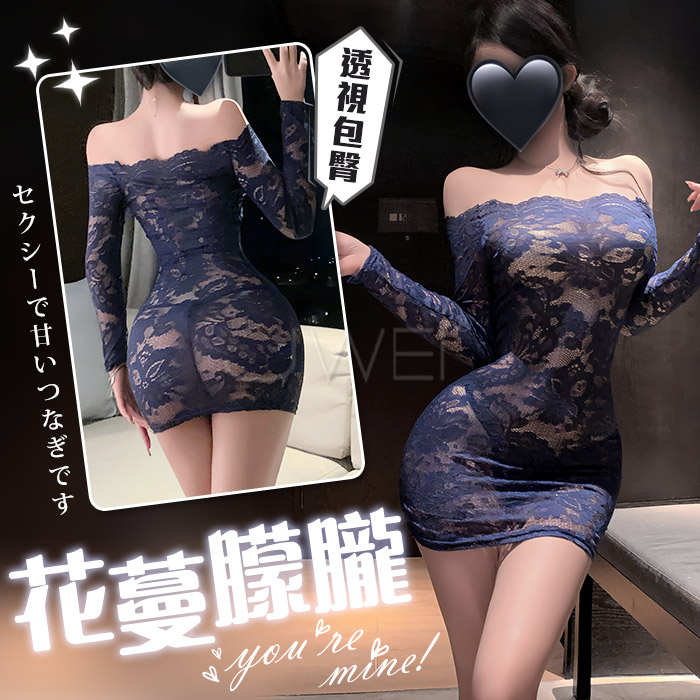 花蔓朦朧.蕾絲雕花一字領透視包臀睡裙【連身裙+T褲+隱形肩帶-藍色】