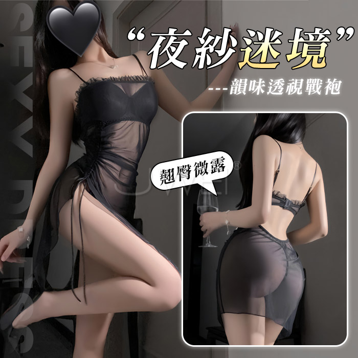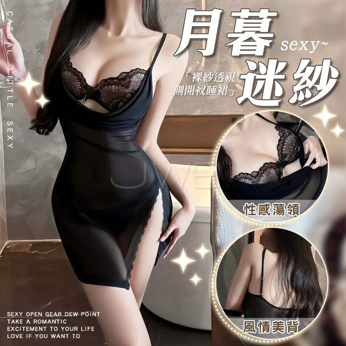 月暮迷紗.性感裸紗蕩領透視側開衩細肩帶美背睡裙【睡裙+T褲-黑色】