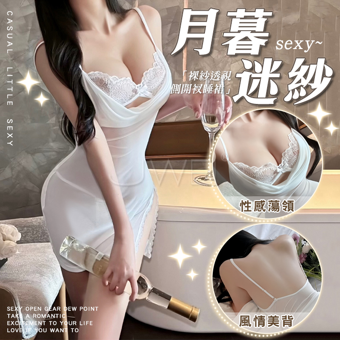 月暮迷紗.性感裸紗蕩領透視側開衩細肩帶美背睡裙【睡裙+T褲-白色】