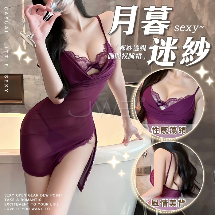 月暮迷紗.性感裸紗蕩領透視側開衩細肩帶美背睡裙【睡裙+T褲-紫色】