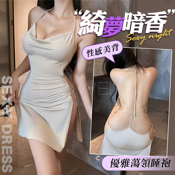 綺夢暗香.優雅蕩領美背綴腰掛脖後繫帶睡裙【奶咖色】