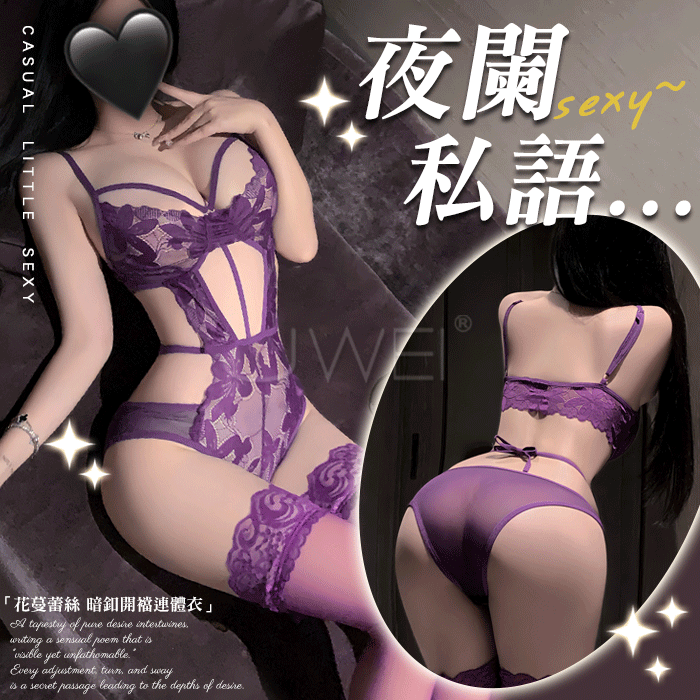 夜闌私語.深V露溝花蔓蕾絲修身暗釦開襠連體衣【紫色】
