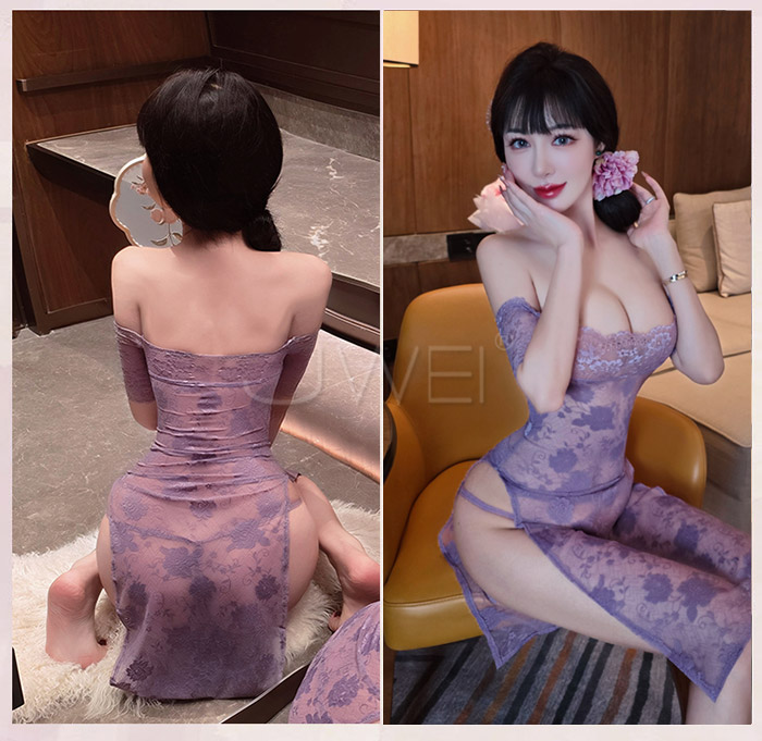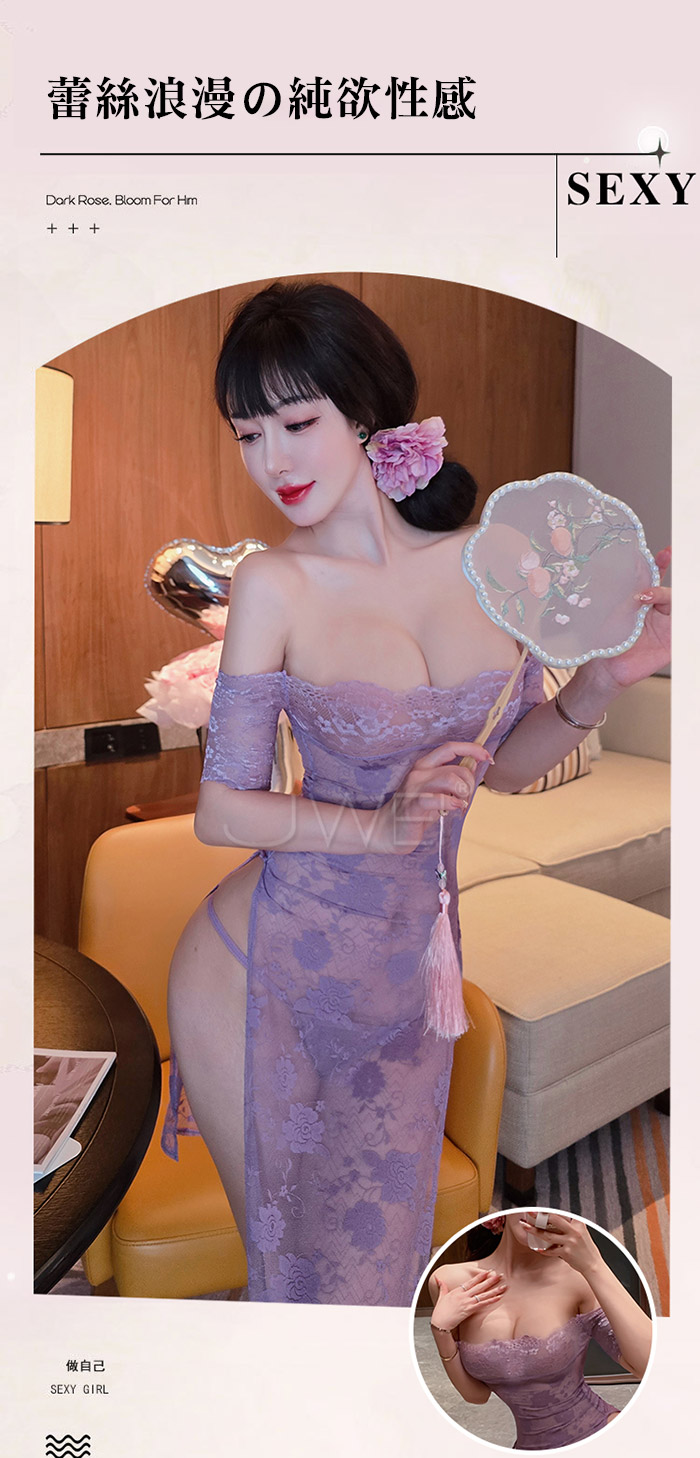 漫野玫瑰.純欲一字肩蕾絲柔美鏤空開衩連身睡衣 【連衣裙+T褲】