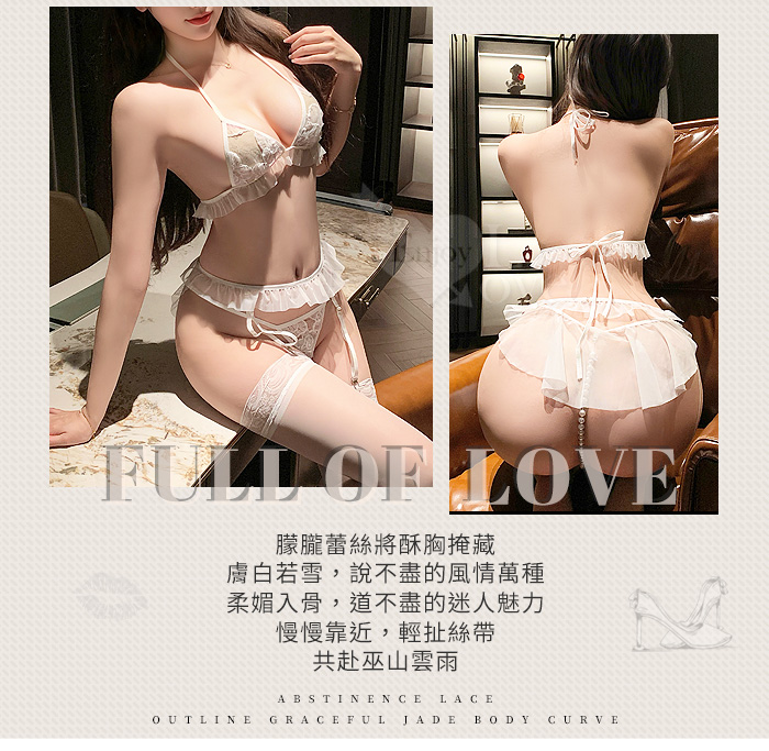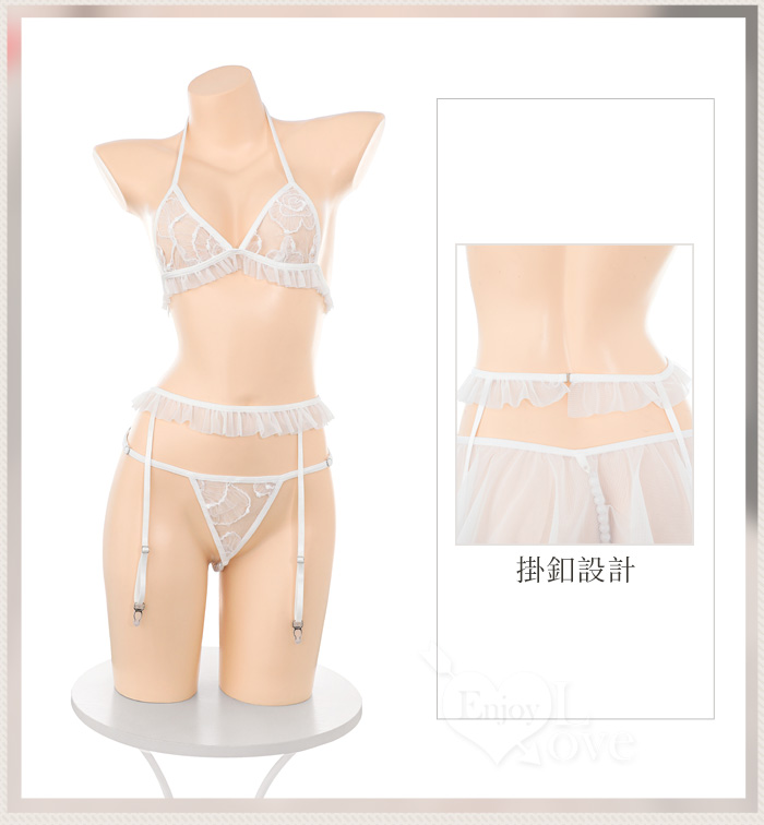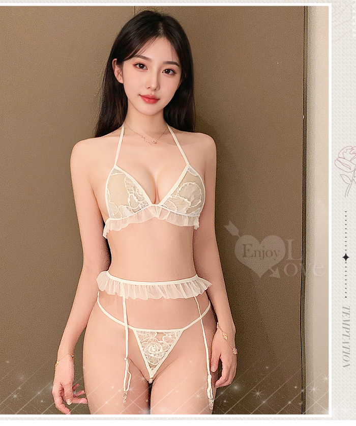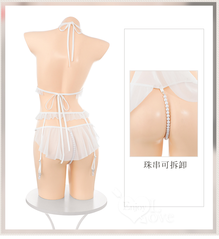 「法式透紗」蕾絲比基尼 × 花邊吊襪帶 × 串珠丁字褲 夢幻四件式套裝