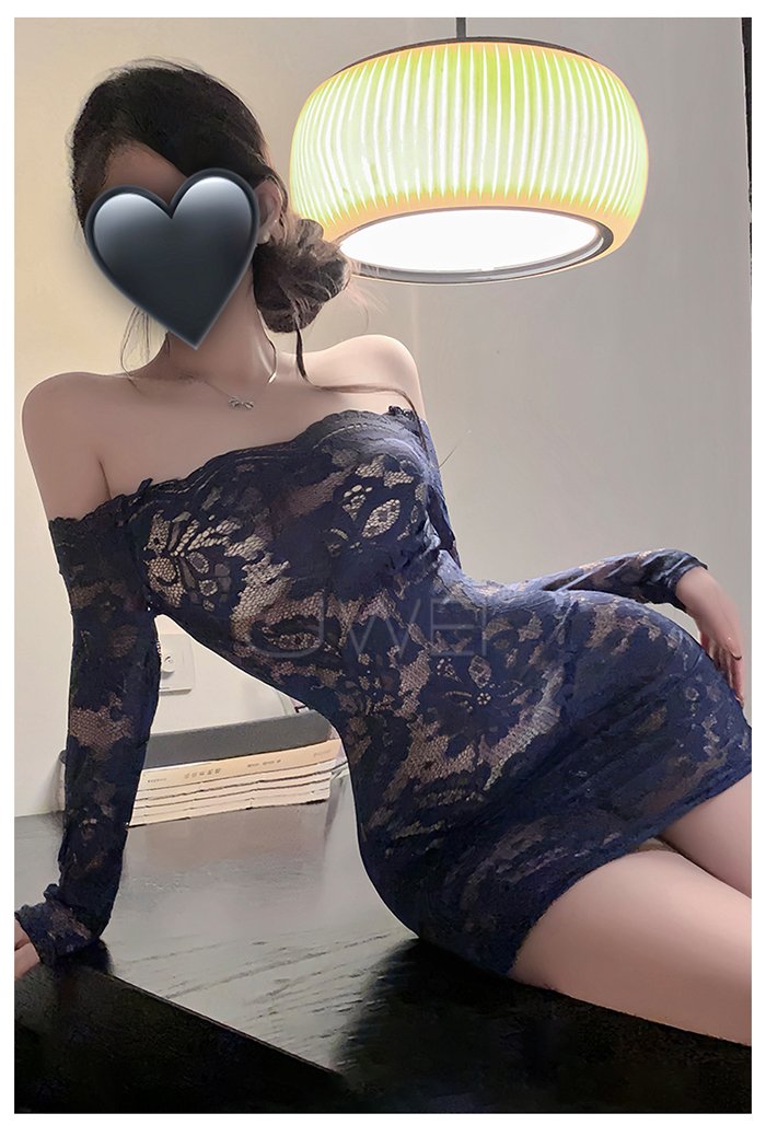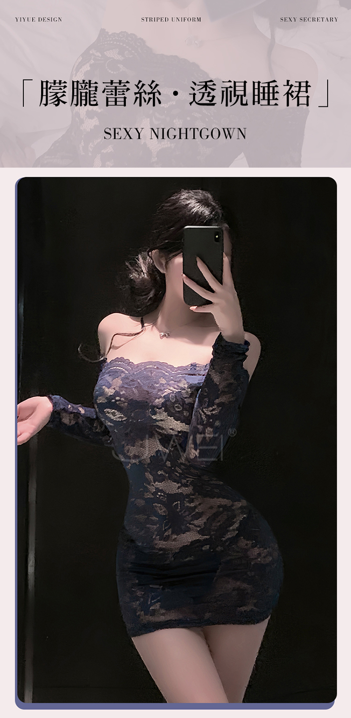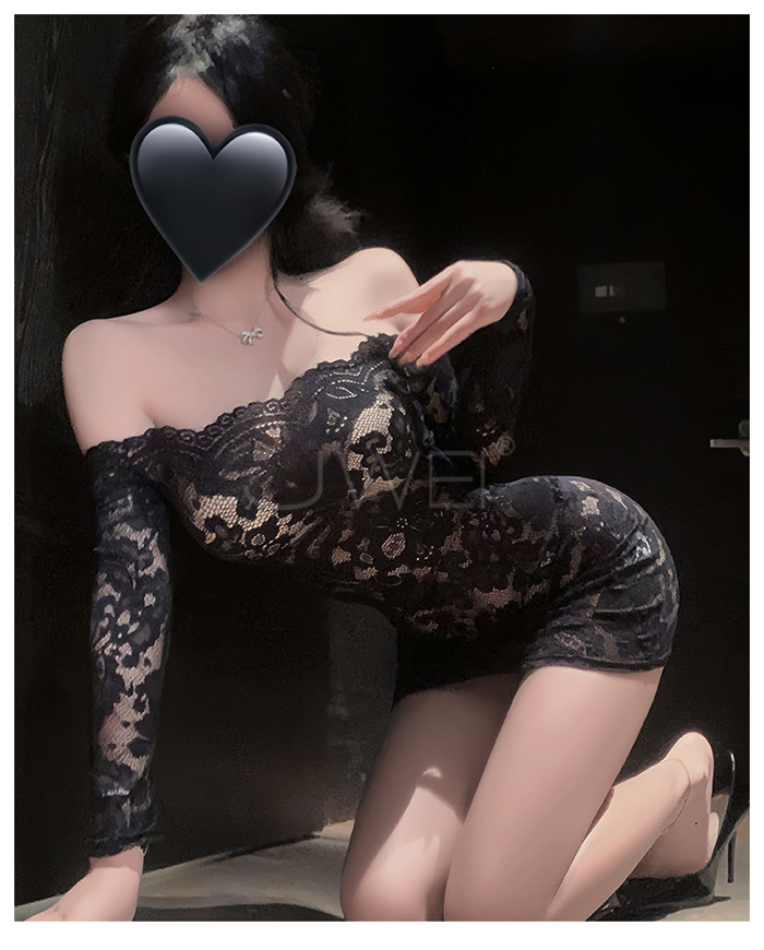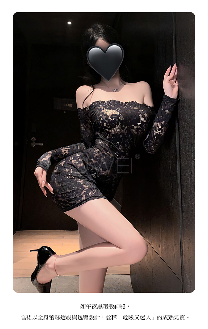 | 花蔓朦朧.蕾絲雕花一字領透視包臀睡裙【連身裙+T褲+隱形肩帶-黑色】