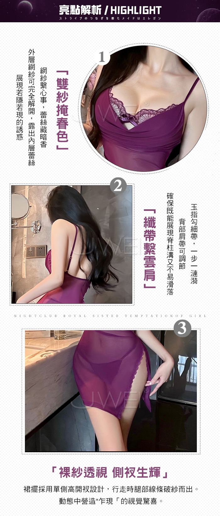 ►您現在的位置:首頁>月暮迷紗.性感裸紗蕩領透視側開衩細肩帶美背睡裙【睡裙+T褲-白色】