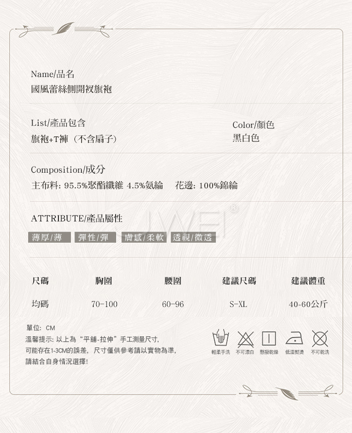 ■內容物:旗袍+T褲 ■適穿尺寸:FREESIZE ■彈性:彈 ■未撐開平量尺寸正負誤差1~2cm,1吋=2.54cm ■注意事項:基於保障消費者個人衛生,此貼身衣物恕不接受退換貨。 (如為商品本身暇疵,接受七日內換貨,請勿試穿,謝謝您)