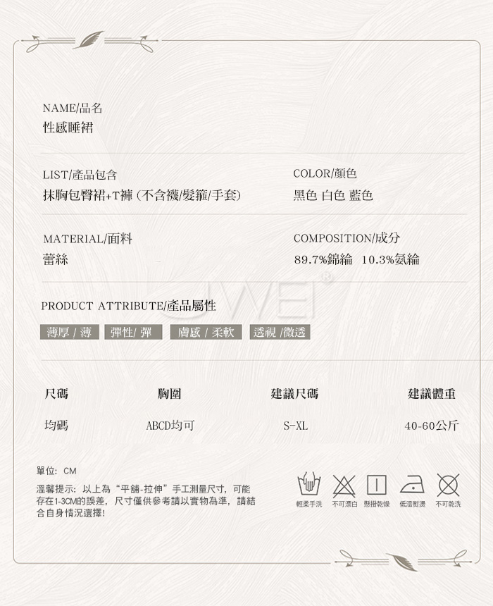 ■內容物:包臀裙+T褲 ■適穿尺寸:FREESIZE ■彈性:彈 ■未撐開平量尺寸正負誤差1~2cm,1吋=2.54cm ■注意事項:基於保障消費者個人衛生,此貼身衣物恕不接受退換貨。 (如為商品本身暇疵,接受七日內換貨,請勿試穿,謝謝您)